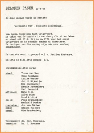 Op 10 april 1994 is het zover: BWV 170, Vergnügte Ruh’, beliebte Seelenlust, wordt uitgevoerd, een solocantate voor alt. Soliste is Nicolette Dekker. Het programma is er nog, met de namen van de instrumentalisten. Behalve Louise komen we nog een bekende tegen: hoboïst Edzard Kuipers. Nu, ruim dertig jaar na die eerste cantate, spelen ze allebei nog mee, terwijl ze beiden de 80 gepasseerd zijn! Maar ook onder de zangers die op 17 december tijdens het jubileumconcert meezingen, zijn een paar zeer oudgedienden: koorcoördinator Lieke Wartena en Nanny van der Wal. Nanny deed in december 1995 voor het eerst mee en viert dus haar persoonlijk 27-jarig jubileum!