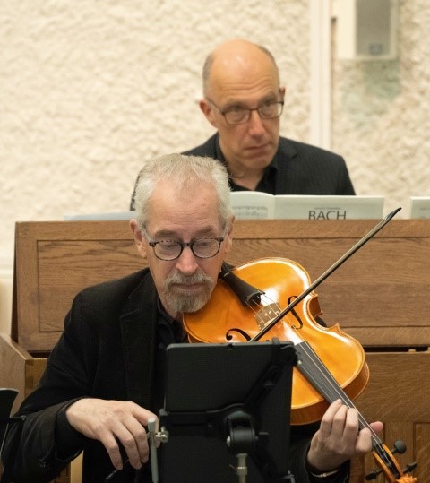Een grote rol daarin heeft dirigent Marion Bluthard. Dankzij haar kennis en enthousiasme kan ABC steeds weer een muzikale prestatie op niveau laten horen. Nog een andere professional met een belangrijke bijdrage is Wietse Meinardi, de vaste organist van de Adventskerk, de thuisbasis van ABC. Tijdens de cantatediensten begeleidt hij de gemeentezang op het hoofdorgel; het kistorgel bespeelt hij tijdens de cantate. Hiernaast ziet u Wietse Meinardi op het kistorgel Rein de Vries op een barokaltviool met een barokstrijkstok. (Foto: Berta van der Kolk)