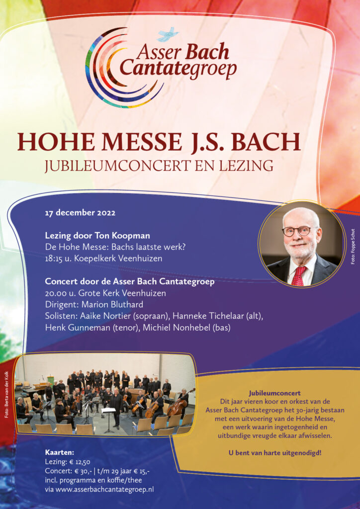 Ton Koopman begon 30 jaar geleden (toen ABC geboren werd) met de opname van zijn Bach-Cantateproject. Hij nam alle cantates op in 10 jaren. Toen hij op verzoek enige ABC fragmenten beluisterde wilde Ton Koopman, de beste Bach dirigent van ons land- van harte medewerking verlenen aan het jubileum: hij geeft op 17 december een luisterrijke lezing, voorafgaand aan de Hohe Messe. Wat een grote eer voor de Asser Bach Cantategroep.