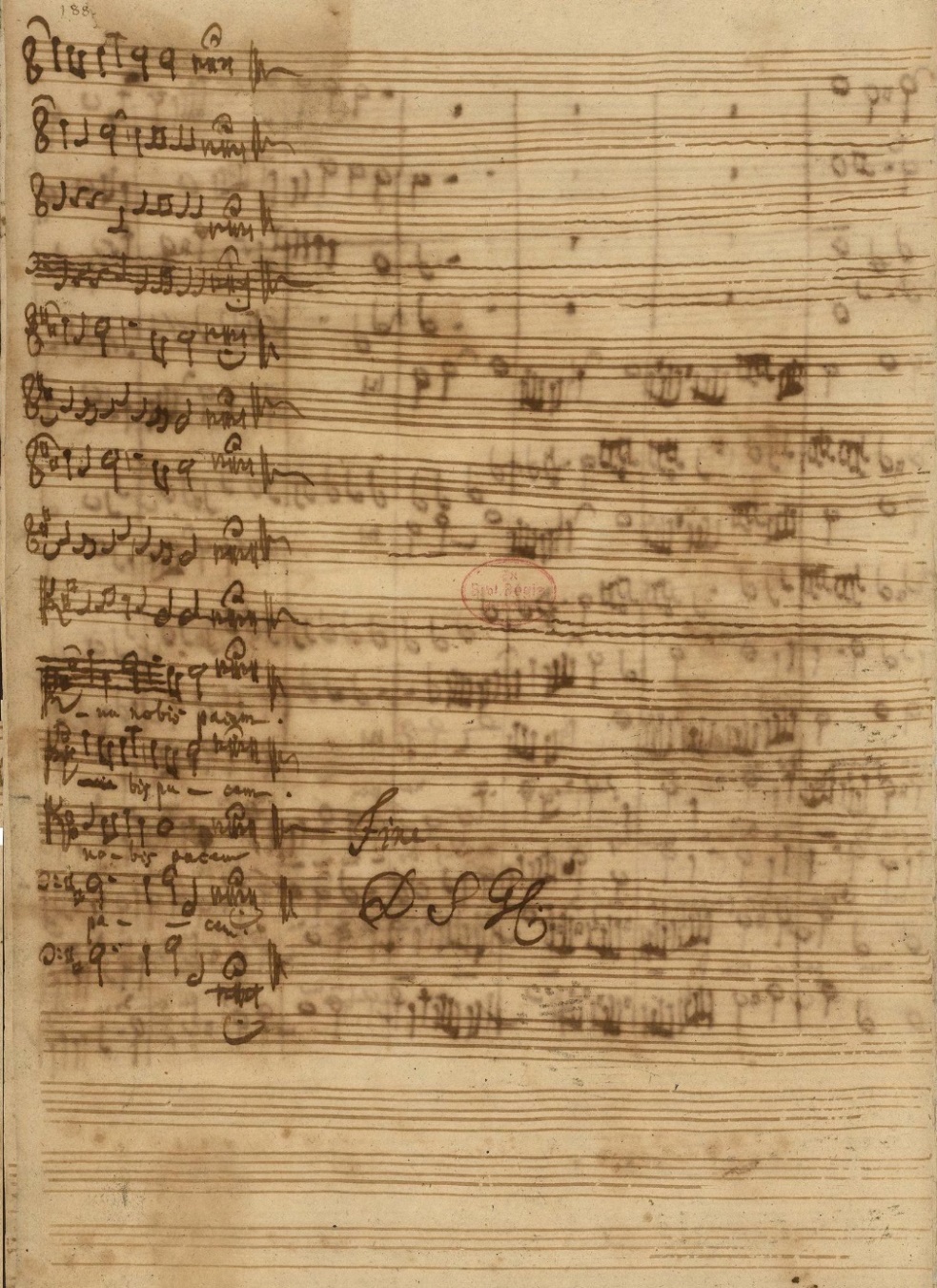 Of het “Sanctus”: dit is bezet met drie trompetten, drie hoge strijkers, een soort “hoogkoor” van drie stemmen en een “laagkoor” van drie stemmen. Tot nu toe voldeed de bezetting met twee hobo’s – maar nee, hier hebben we ineens drie onafhankelijke hobostemmen. De goddelijke Drie-Eenheid moet je wel wat waard zijn!
